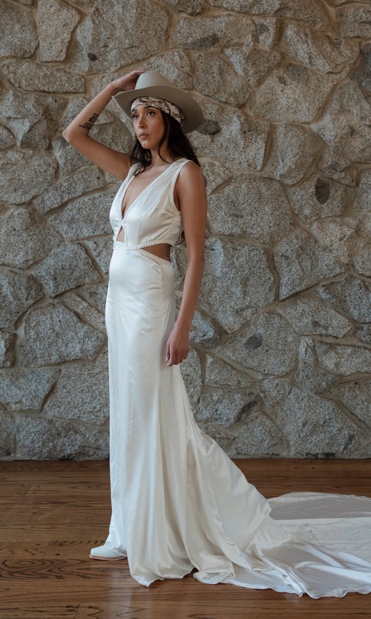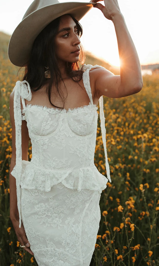 Daughters of Simone gowns range from $2,900 to $3,200, perfect for the free-spirited bride drawn to bohemian lace and effortless silhouettes.Β