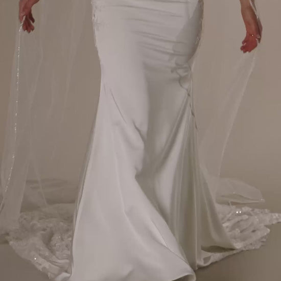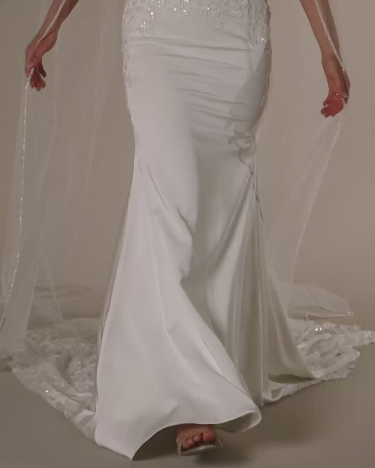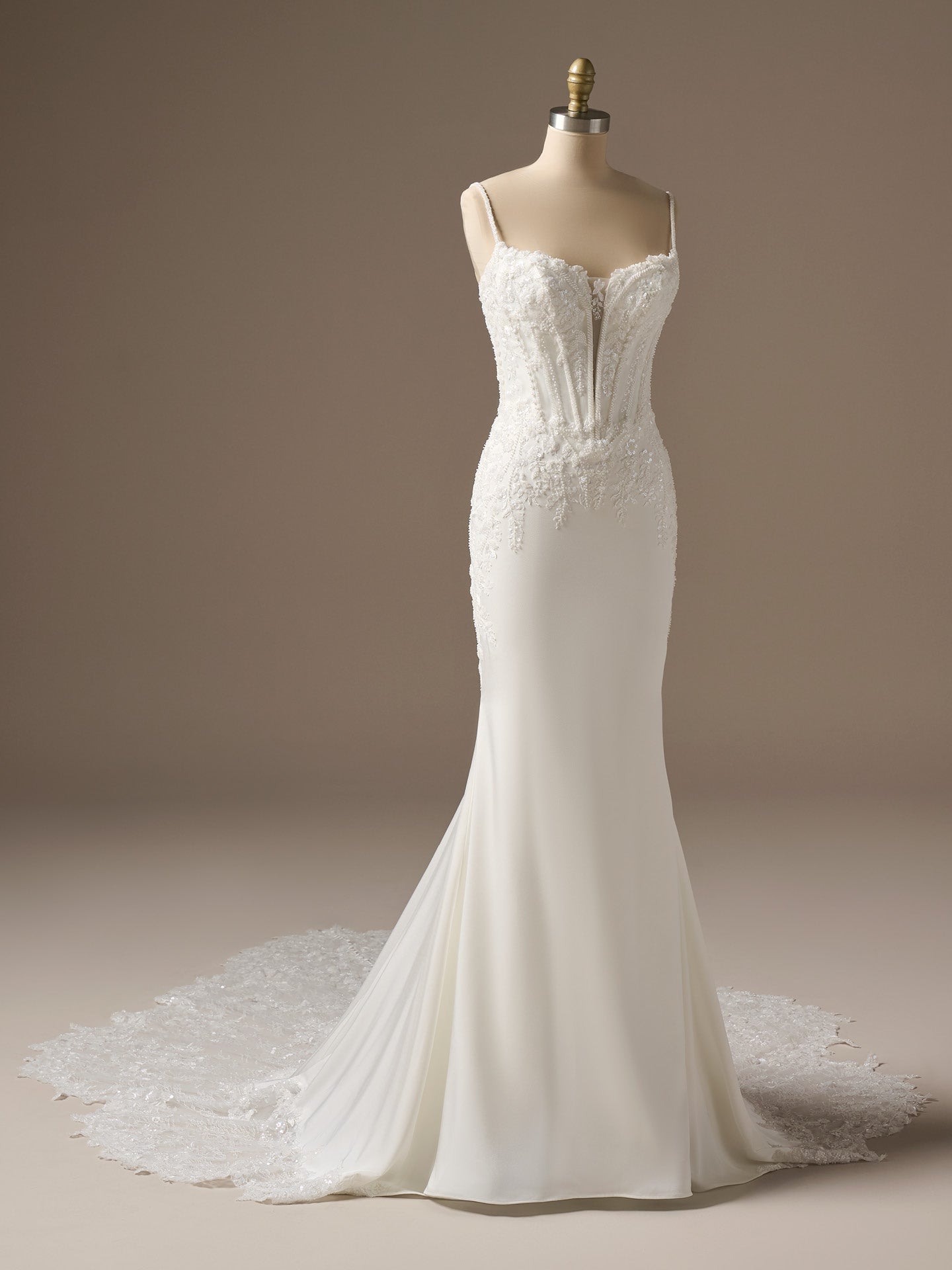Dramatic. Dazzling. Unforgettable. The “India” gown by Maggie Sottero is a breathtaking sheath wedding dress that blends couture beading with timeless sophistication. Crafted from luxurious Trento satin and adorned with shimmering sequin and beaded lace motifs, this gown captivates from every angle. The deep illusion cat eye neckline and medallion lace detailing create a statement of modern romance, while delicate beaded spaghetti straps add just the right touch of sparkle. Finished with a sculpted basque waist and an extended illusion lace scalloped train, “India” is the epitome of elegance and allure — perfect for the bride who wants to shine effortlessly on her day.