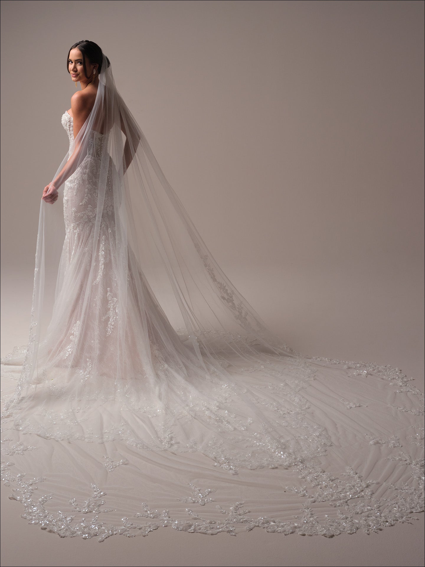 The Maggie Sottero "Benjie Royale" is a stunning maximalist mermaid wedding dress featuring shimmering sequins and intricate beaded lace motifs over delicate Chantilly lace. Its glitter illusion bodice is adorned with beaded trim, highlighting a plunging illusion sweetheart neckline and beaded lace medallion detail. Lined with luxurious Rosario crepe back satin, it offers a covered button over zipper closure for a seamless finish. The extended illusion scalloped lace train, embellished with sequins and beads, can be customizedβeither lengthened for drama, shortened, or removed for ease. Additional options include vintage-inspired back buttons, glitter tulle in place of lace, and a lined bodice and hip dips for varied coverage. The horsehair hem provides elegant shape, making this gown both purposeful and breathtaking. Add on the beautiful matching veil or a detachable train to make the look yours!