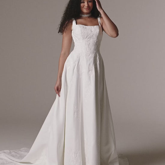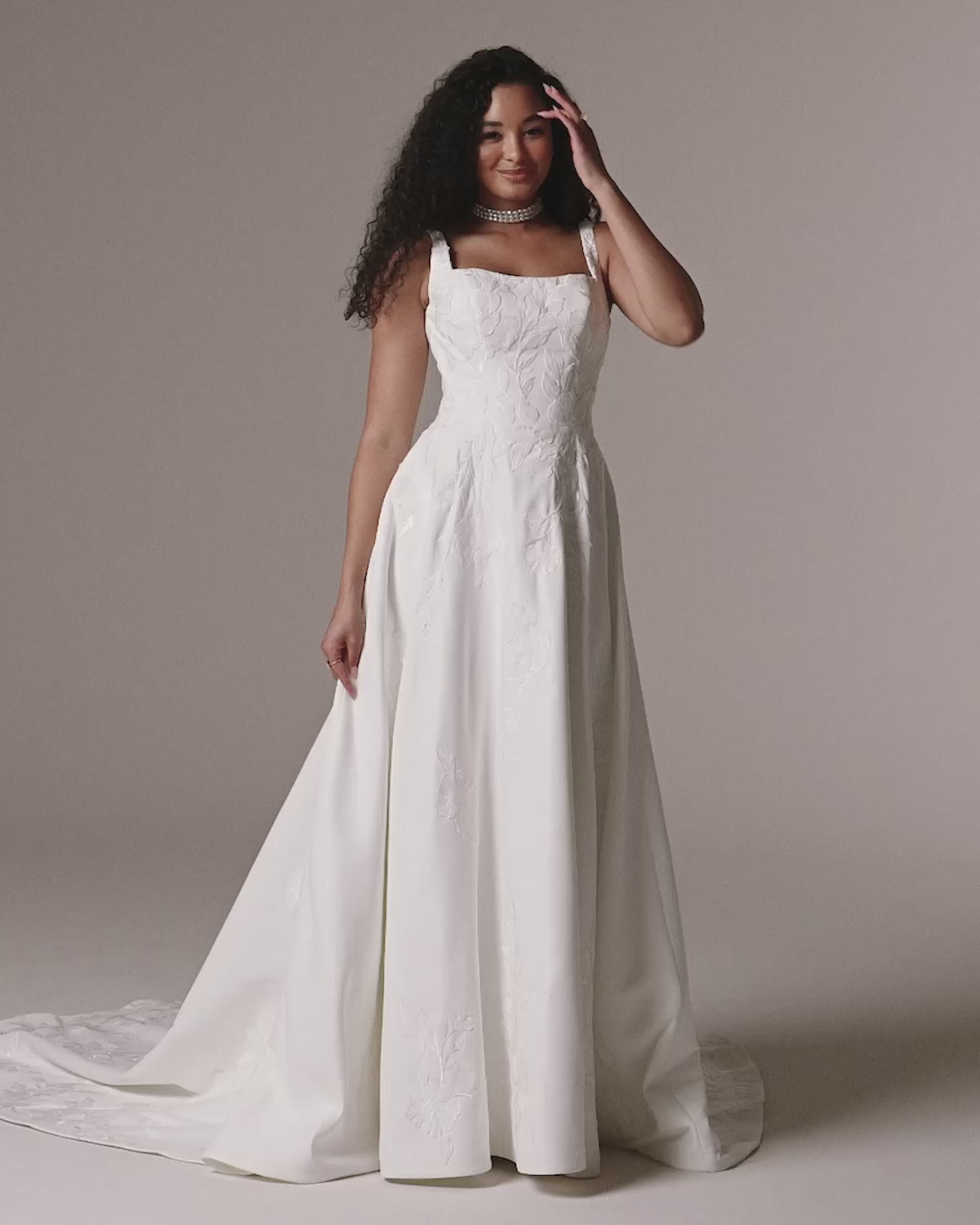 The Maggie Sottero "Sheridan" gown is a timeless A-line wedding dress crafted in luxe Mago satin with unembellished lace motifs for a touch of understated romance. Its square neckline with tank straps offers a clean, modern frame, while the low V-back adds graceful allure. A soft Basque waistline flatters the silhouette, flowing into a skirt finished with lace-accented hem and practical pockets for an effortlessly chic look. This gown is lined with sustainable Kahili recycled content lining for comfort and finished with a zipper closure and covered buttons trailing to the hem. Designed for versatility, the "Sheridan" can be worn with its classic tank straps, as a strapless style, or paired with detachable off-the-shoulder satin cap sleeves. Train options allow you to extend for added drama, shorten for ease, or remove completely for a more casual celebration.