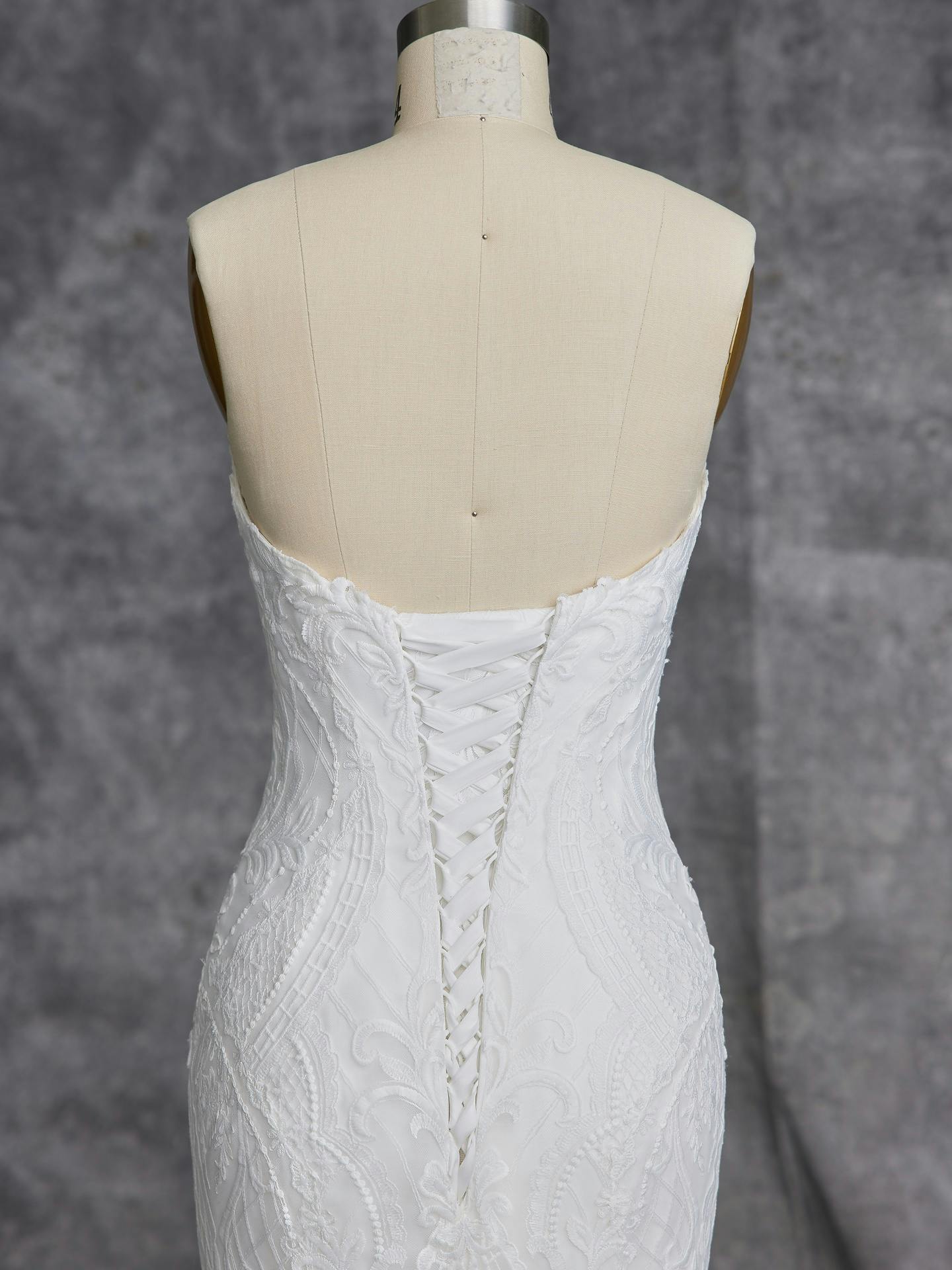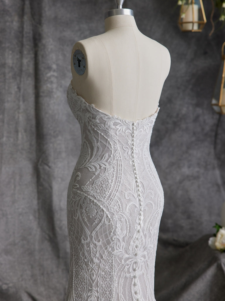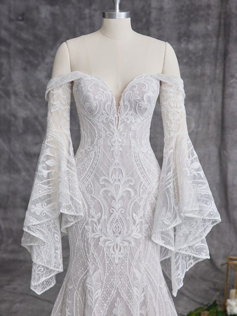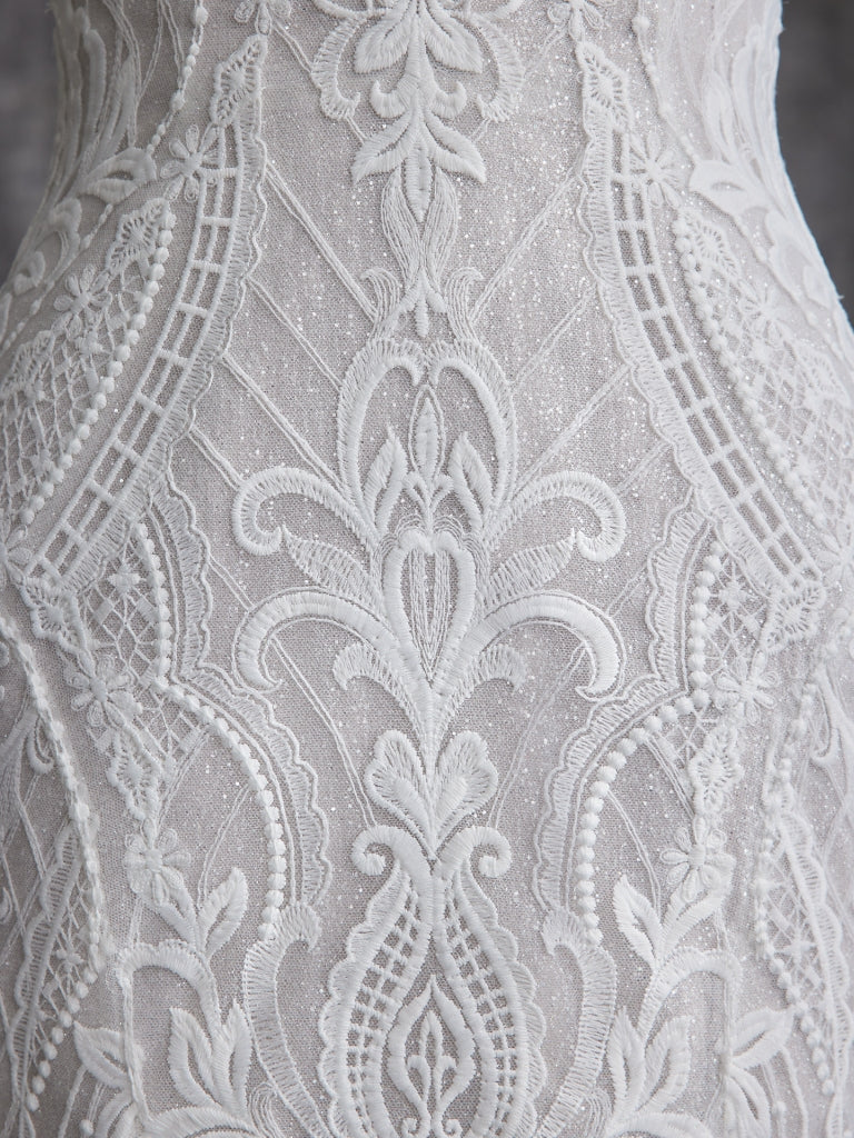 The Sottero & Midgley "Bronson" gown is a star-worthy fusion of boho romance and vintage glam. This fit-and-flare silhouette features allover unembellished lace layered over glitter tulle, offering both texture and shimmer in every movement. Inspired by the effortless allure of 1970s fashion, the design highlights curves with a plunging illusion sweetheart neckline and a sultry, sculpted fit. The gown closes with a zipper, inner elastic closure, and covered buttons trailing to the hem, but can be customized with a lace-up back for added drama. Brides may also choose to shorten or remove the train for a more casual, carefree look.Β Styling options allow you to transform "Bronson" to fit your vision: detachable illusion lace cap sleeves and long illusion lace bell sleeve armbands create versatile ways to elevate this already unforgettable gown.