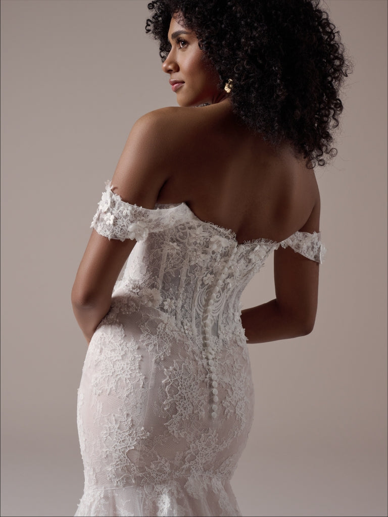 This Maggie Sottero "Takera" wedding dress showcases expert craftsmanship with its basque waist and strapless off-the-shoulder neckline. Featuring Chantilly lace and pearl-accented 3-D floral appliqués on the illusion bodice and long sleeves, it elegantly highlights exposed boning details for structure. The dress is lined with luxurious Rosario crepe back satin and fastens with a covered button over zipper closure. Its scalloped illusion Chantilly lace train can be customized—extended, shortened, or removed—to suit your desired level of drama. Additional options include vintage-inspired covered buttons down the back, glitter tulle for a subtle sparkle, and a lined or unlined bodice. This gown has a matching veil and optional sleeves. Go strapless, add cap sleeves, or keep the original long sleeves!