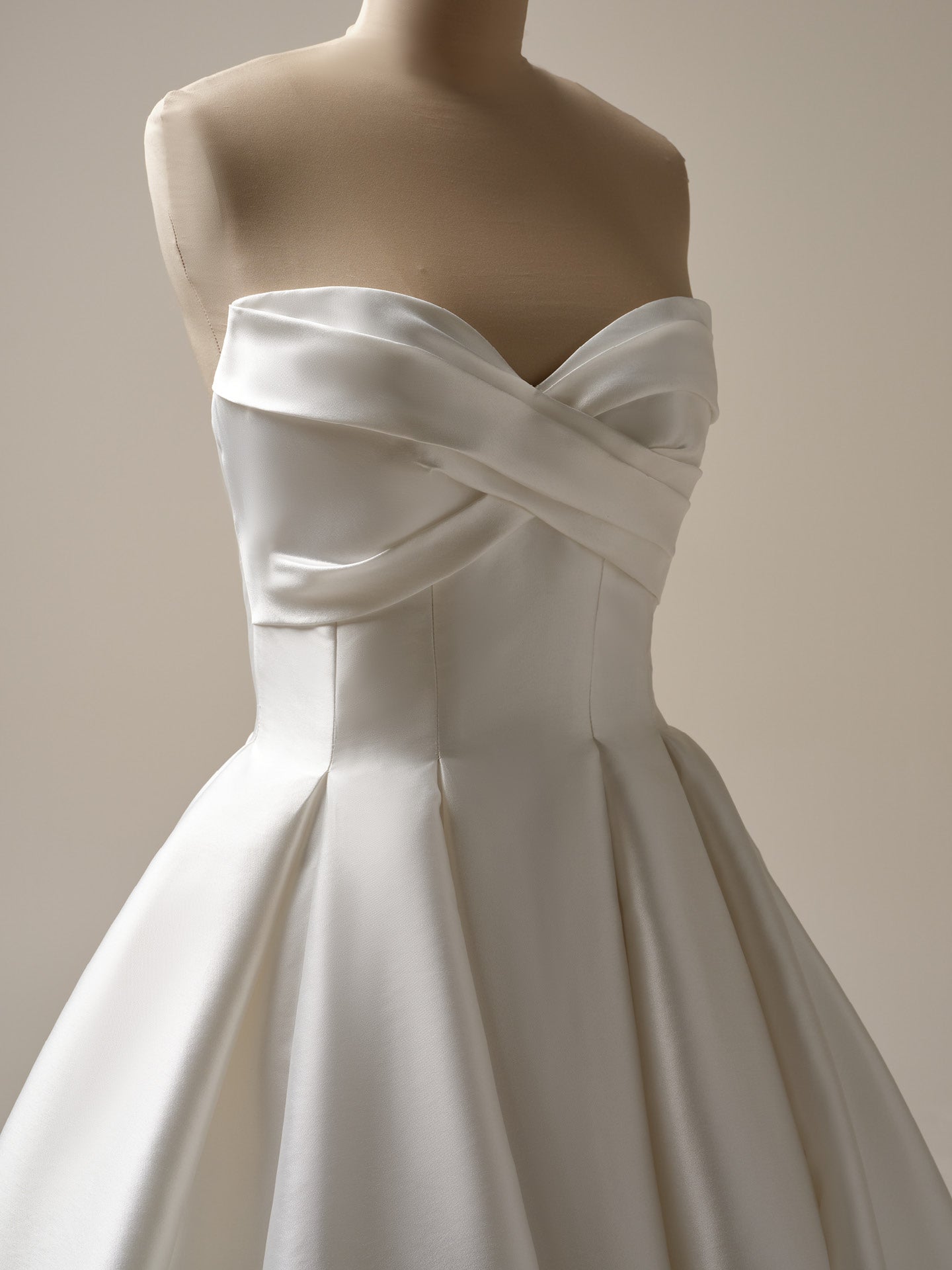 Effortlessly regal with a modern twist, “Zinaida” by Maggie Sottero is crafted in luxurious Mikado for the bride who loves timeless elegance with a touch of whimsy. The pleated bodice and off-the-shoulder cap sleeves frame a romantic sweetheart neckline, while a subtle keyhole adds just the right hint of intrigue. A classic V-back and a line of covered buttons trail gracefully to the hem, balancing sophistication with charm. Complete with hidden pockets for a touch of practicality, this gown embodies refined beauty from every angle — a perfect blend of structure, softness, and modern romance. Remove the cap sleeves and keyhole to find the look that truly matches your dream vision!